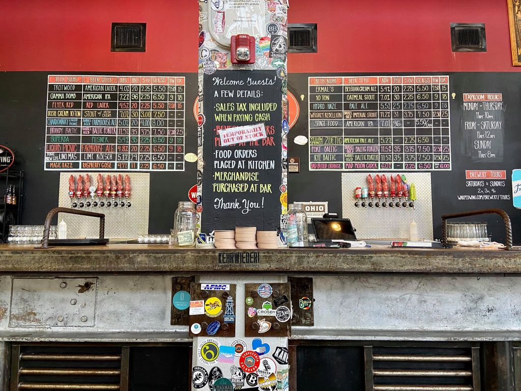 Located at the heart of downtown Dayton, Warped Wing Brewing Company made its home in the former site of the Buckeye Brass & Iron Factory, circa 1938. Seriously, this building looks indestructible. Thick, concrete walls come together to brace an incredibly high ceiling and the foundry’s original 10-ton industrial crane lines the interior of the taproom, still sitting on the steel tracks it once used to hoist metal during it’s manufacturing days. Directly below this steel giant sits Warped Wing’s brewing tanks, taking up a good portion of the taproom floor. Despite the obvious industrial vibe, the brewery gives off a slight German beer hall vibe too – that’s probably just because of the long tables though. They even have a large glass garage door that opens up during the warmer months. It was closed when I visited but I imagine it’s pretty neat!