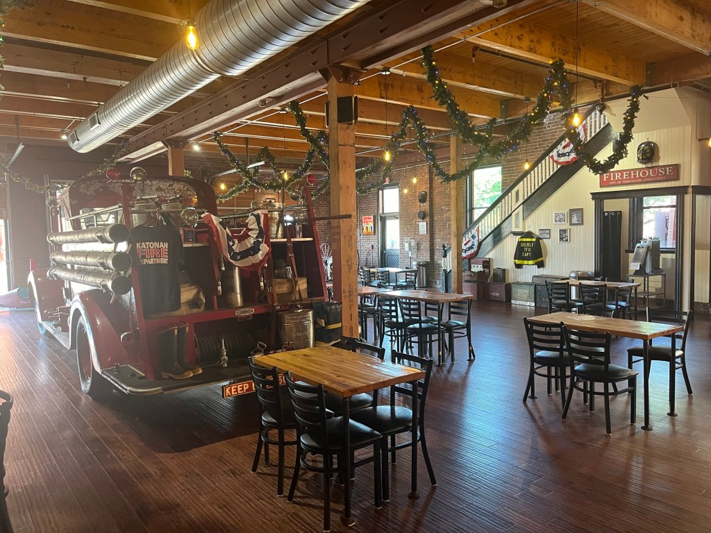 Chris: The large flight really gave us a chance to sample a bunch of different beers from Bad Dog and others. My favorite beer from Bad Dog was the Amarillo Bliss, a light wheat beer that I could easily imagine crushing on a hot day. Another wheat beer I had from Bad Dog was the Watermelon Tail Wagger which was more flavorful, but wasn’t quite as crisp. Other, I really enjoyed the aesthetic of the taproom more than anything as it was set inside an old firehouse with a full fir engine inside.